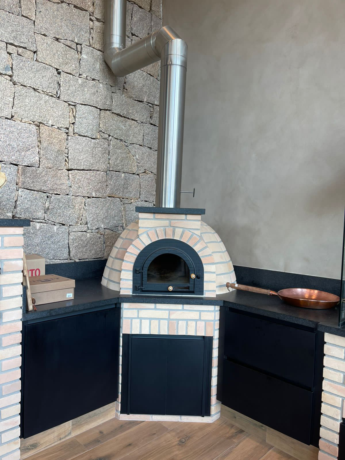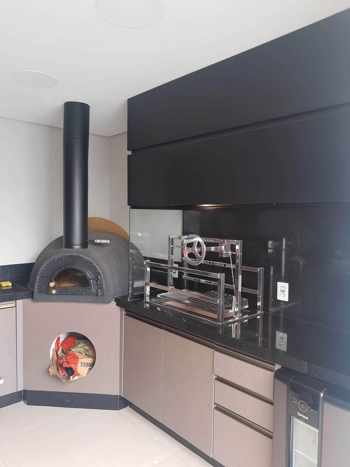 O espaço gourmet completo integra churrasqueira, fogão a lenha com forno de ferro fundido, e Forno de pizza Iglu com vários tipos e tamanhos, proporcionando um ambiente agradável para cozinhar com a sua família e amigos,