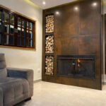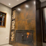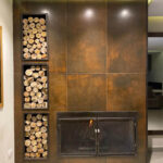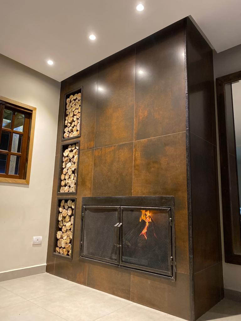 A parte interna é montada com uma coifa trapezoidal que fica acima da caixa de fogo acompanhando o damper regulador de calor totalmente confeccionado aço carbono e revestida com isolamento térmico evitando assim a passagem de calor para alvenaria.